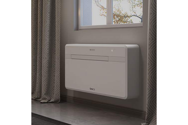 De Unico Evo 30 HP EVANX Monoblock airconditioner zonder buitenunit in HP uitvoering HP = Heat Pump oftewel warmtepomp, ontworpen voor installatie laag aan de wand, zoals de positie van een conventionele watergevoerde radiator.